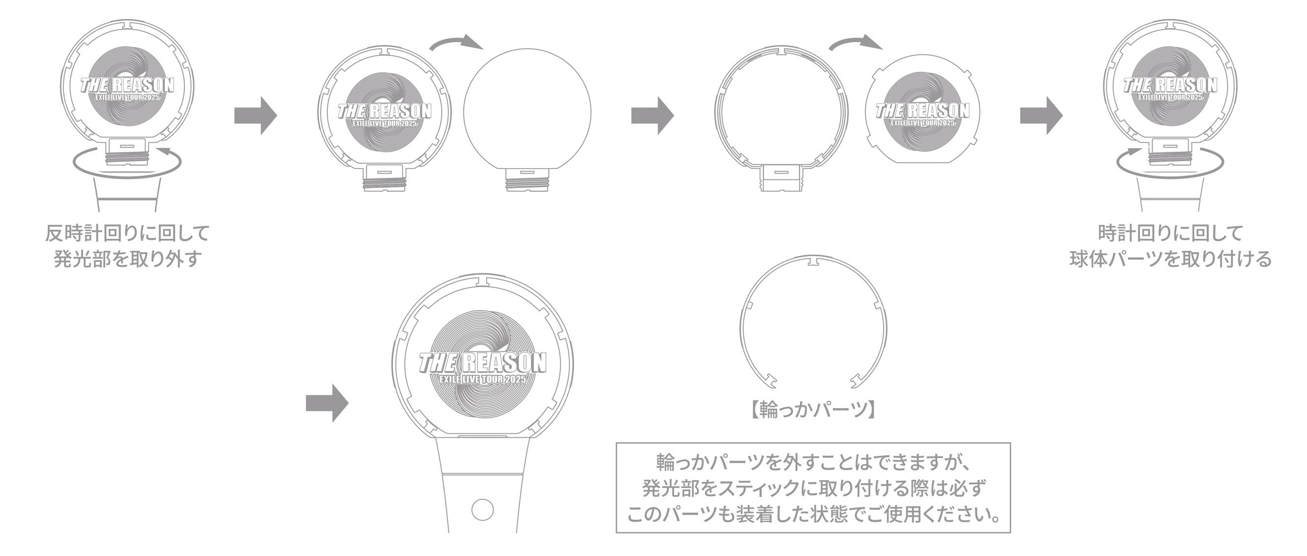 ※ 輪っかパーツを外すことはできますが、発光部をスティックに取り付ける際には必ずこのパーツも装着した状態でご使用ください。